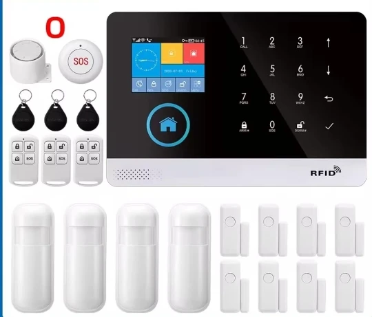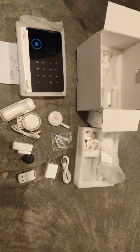 Everything as described: for a very affordable price I got a control panel, 10 door/window sensors, 5 IR sensors, three remote controls, three RFID sensors, a wired siren, an SOS button. All accessories are wireless and come with a battery. Even though the door/window sensors are powered by just one CR2032 battery, they have sufficient range to cover the entire house. The control panel connects to Wi-Fi and can be controlled via the Smart Life app, and it accepts a 4G SIM card to send alarms with phone calls and SMS messages. All tested and working. A suggestion for other users: when you activate the detectors of the kit (they already arrive memorized by the control panel) by turning on the power supplies, keep the control panel off and turn it on AFTER the detectors are active, otherwise you might have malfunctions (which can be resolved with a cycle of turning the control panel off/on). I hope it lasts.