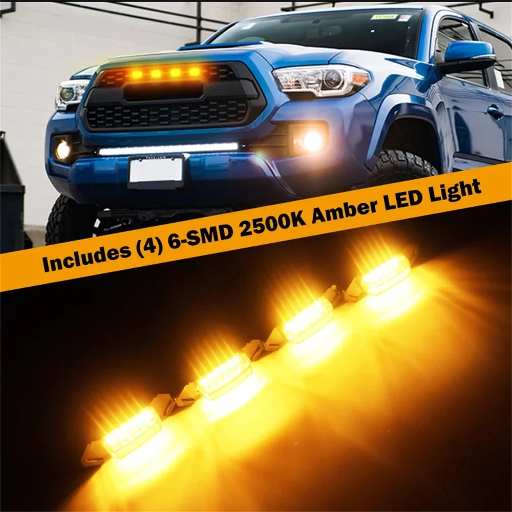 This complete Raptor Style Grille Light Kit includes a 4-piece smoked lens LED grille mount assembly and wiring harness. For aftermarket Tacoma TRD Pro grille mesh openings that emit ultra-bright amber LED light.